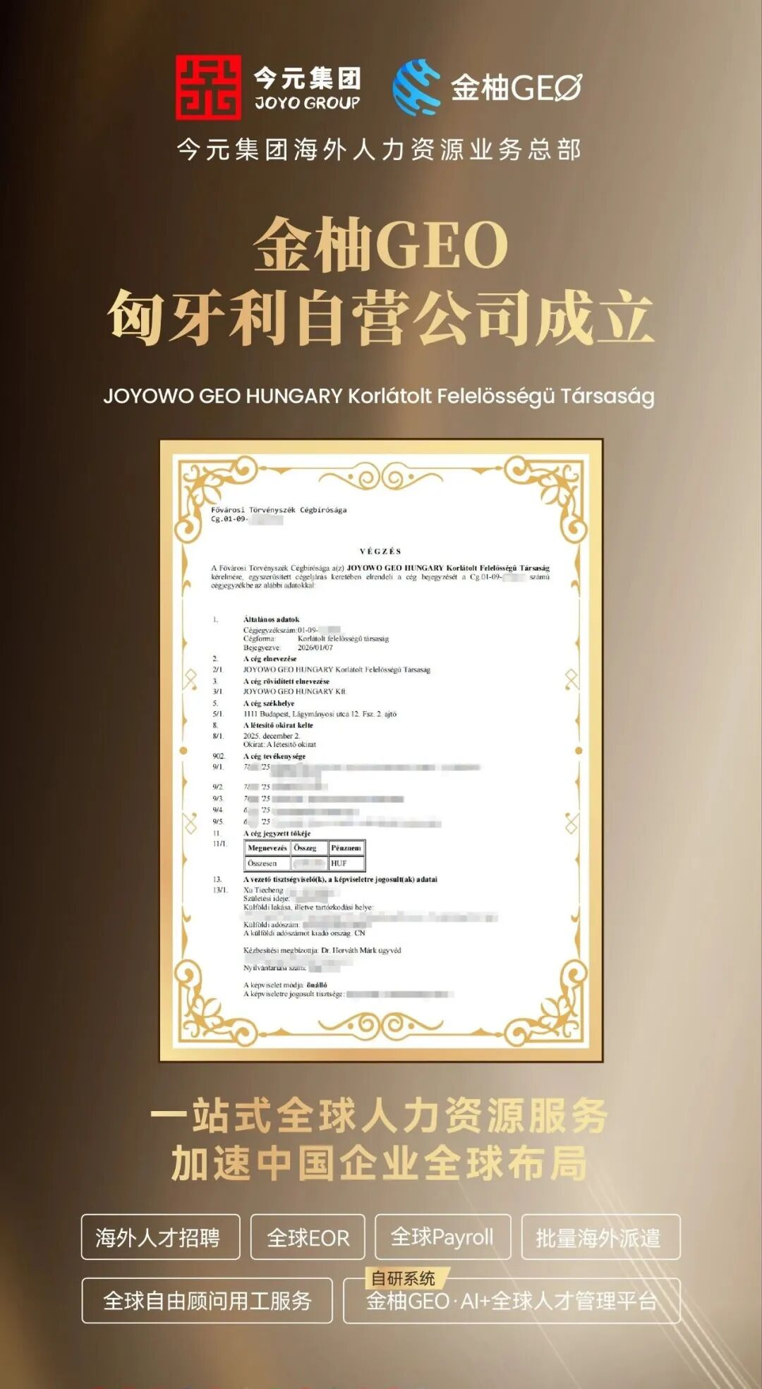 今元集团始终以“立足中国,服务全球”为理念,以人力服务为纽带,一边连接中企全球化发展需求,一边对接匈牙利及欧洲的市场机遇与人才资源,更衔接国家人才战略与就业保障目标。未来,依托专业的本地化服务、领先的AI技术平台,今元集团将持续为出海企业提供更贴合实际需求的跨境人力管理解决方案,助力更多中国品牌在欧洲市场站稳脚跟、拓展版图;同时,为提升我国对外开放水平、实现人才强国战略目标、促进中欧经贸合作高质量发展注入持续动能。