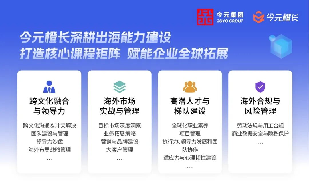 围绕出海核心痛点,今元橙长打造四大核心课程模块: