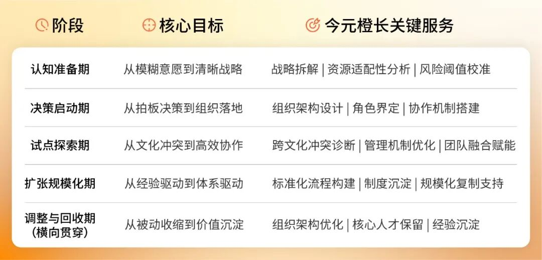 企业出海是一个持续演进的过程,不同阶段的战略目标、业务场景、核心痛点存在显著差异,培训与咨询服务需精准适配、同频共振。今元橙长突破传统培训模式,构建覆盖出海“ 认知准备-决策启动-试点探索-规模扩张-调整回收 ”五阶段的定制化服务体系,实现全周期精准赋能。