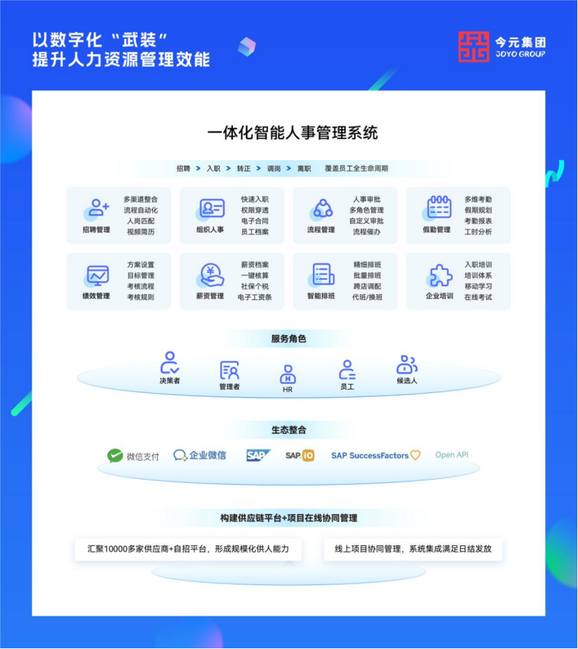 今元集团数字化产品紧密贴合企业实际应用场景,全面覆盖人才招聘、入转调离、在职管理、薪酬绩效、离职流转、跨境用工全生命周期环节,打造一站式全流程数字化人力解决方案。通过深度融合AI与人力资源业务场景,助力企业优化人力成本结构、提升内部管理效率、强化核心经营竞争力,以数智化力量护航企业长期稳健可持续发展。