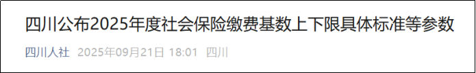 9月21日,四川省人力资源社会保障厅公布全省2025年度社保缴费基数。