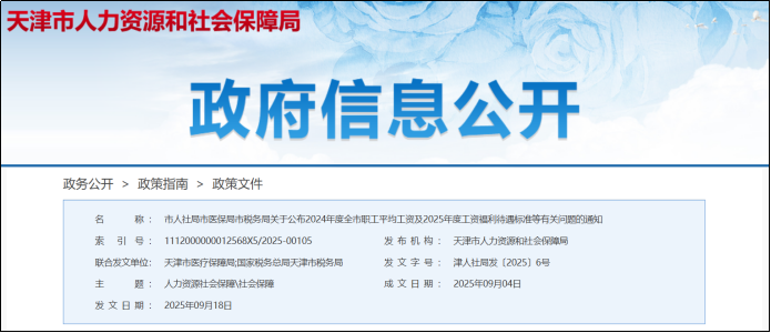 9月18日,天津市发布2024年度全市职工平均工资及2025年度工资福利待遇标准等有关问题的通知,从2025年10月1日起执行。