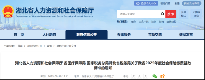 9月19日,湖北省发布2025年度社会保险缴费基数标准通知。
