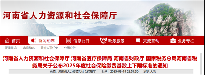 9月19日,河南省公布2025年度社会保险缴费基数上下限标准的通知,自2025年7月1日起执行。