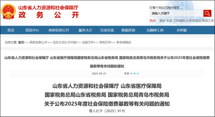 9月23日,山东省人力资源和社会保障厅发布2025年社会保险缴费基数上下限的通知,执行时间为2025年1月1日至12月31日。