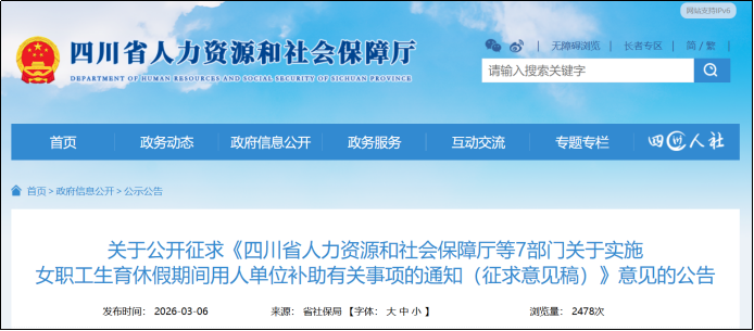3月6日,四川省人力资源和社会保障厅公布《四川省人力资源和社会保障厅等7部门关于实施女职工生育休假期间用人单位补助有关事项的通知(征求意见稿)》,正式面向社会公开征求意见,征求意见期限为2026年3月7日至3月13日。