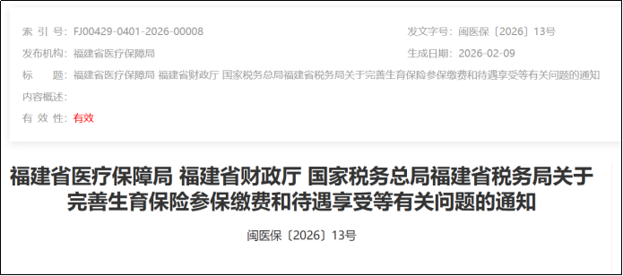 2月9日,福建省医疗保障局发布了《关于完善生育保险参保缴费和待遇享受等有关问题的通知》,通知自2026年3月1日起施行,有效期5年。