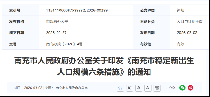 3月2日,南充市人民政府公布《南充市稳定新出生人口规模六条措施》(以下简称《六条措施》),适用于2026年1月1日至2028年12月31日期间结婚登记和生育的家庭,夫妇双方或一方为南充户籍且新生儿户籍登记在南充,孩次按女方生育并存活子女数认定。